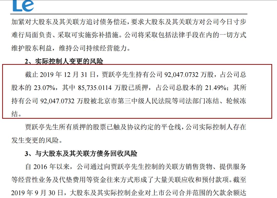 基金君注意到,截至2019年12月31日,贾跃亭持有乐视网92,047万股,占公司总股本的23.07%,其中85,735万股已质押,占公司总股本的21.49%;其所持有公司92,047万股被北京市第三中级人民法院等司法部门冻结、轮候冻结。