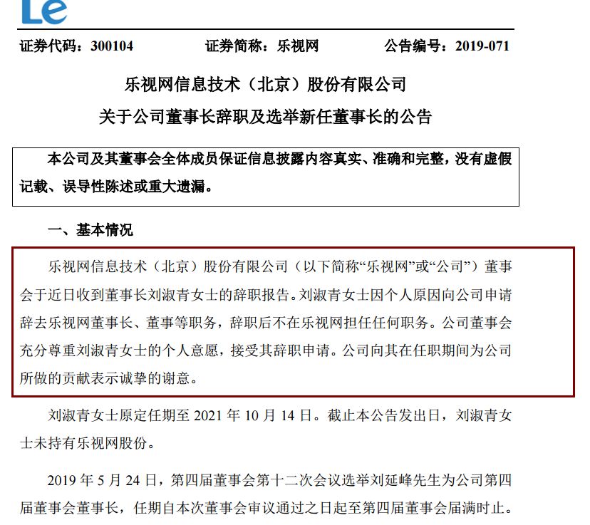 2019年5月25日,乐视网披露,刘淑青因个人原因向公司申请辞去乐视网董事长、董事等职务,辞职后不在乐视网担任任何职务。刘淑青系融创派驻乐视网的代表,2018年3月,孙宏斌辞去乐视网董事长的职务,由刘淑青接过重任,因此她的辞任曾引发轩然大波。