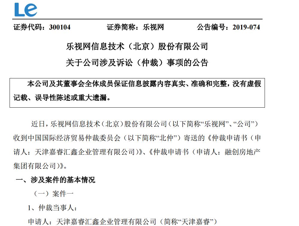 去年6月12日晚间,乐视网发布公告称,已收到融创房地产集团有限公司、融创旗下公司天津嘉睿申请的仲裁,分别要求公司立即支付借款本金12.9亿元、19.14亿元及利息损失、违约金等款项,合计超32亿元。