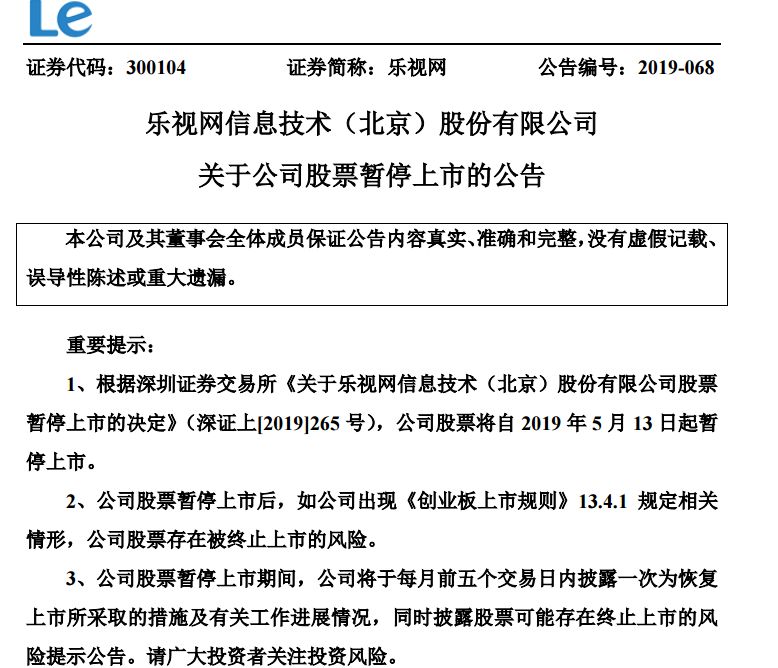 2018年年报显示,乐视网实现营业收入15.58亿元,实现归属上市公司股东的净利润亏损40.96亿元,2018年末归属母公司净资产为-30.26亿元。2019年5月10日,深交所宣布乐视网被暂停上市。