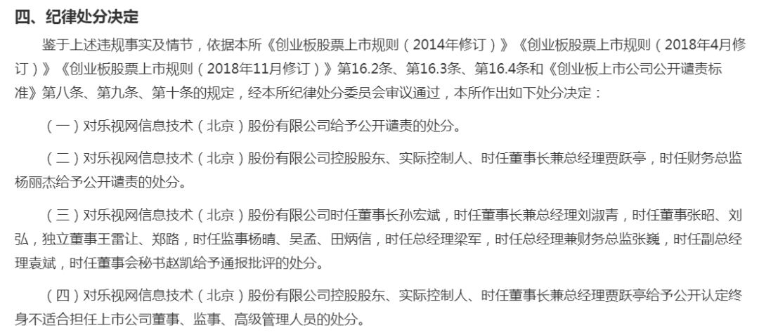 1月2日,乐视网发布公告称,于2019年12月31日深圳证券交易所下发的《关于对乐视网信息技术(北京)股份有限公司及相关当事人给予纪律处分的决定》认为乐视网违规事实清楚,情节严重,对乐视网给予公开谴责的处分。
